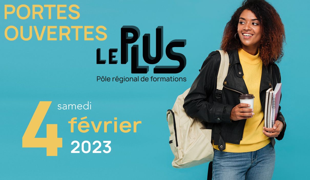 La journée portes-ouvertes du Pôle régional de formations, Le PLUS, se déroulera le samedi 4 février 2023 à Saumur. Pendant cette journée, vous êtes invités à découvrir Le Plus et ses formations et à rencontrer le personnel, les enseignants, les formateurs et les étudiants afin d'échanger sur un projet d'étude.