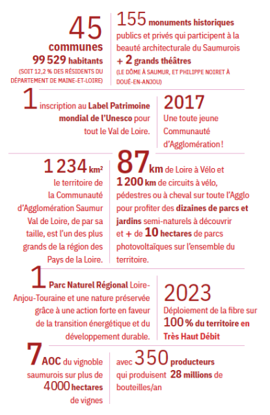 Puisque l’on sait désormais qu’il est facile d’y venir, il est temps d’évoquer, sans exhaustivité, toutes les autres qualités du cadre de vie exceptionnel de ce territoire situé en plein cœur du Parc Naturel Régional Loire-Anjou-Touraine. On citera, pêle-mêle, l’alliance parfaite de la richesse architecturale et de la préservation de la nature ; la beauté et la diversité des paysages qui varient entre la Loire, son côteau, les forêts, les vignes, les rivières... ; le développement exponentiel des pistes cyclables et des sentiers pédestres ou équestres ; le déploiement de la fibre, qui permet bien sûr de télétravailler confortablement de chez soi ou d’un lieu dédié ; une programmation événementielle et culturelle riche et tout au long de l’année, avec une place particulière donnée au patrimoine et à sa mise en lumière... et tout le reste est à découvrir sur ce site !