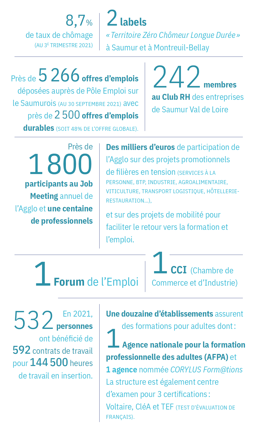 Pour vous former, la CCI et le CFA vous accompagnent dans votre parcours professionnel parmi des dizaines de  formations. Le tissu associatif ou institutionnel, lui aussi, offre un panel d’activités et de suivis : l’Espace Jacques-Percereau vous propose des ateliers et anime la plateforme saumuroise Coup de Pouce Emploi ; l’association SCOOPE propose aussi un accès public, gratuit et accompagné au numérique ; la Mission Locale du Saumurois, Aquasylva, Territoire Zéro Chômeur Longue Durée, le GRETA, Pôle Emploi et bien d’autres encore... se tiennent à votre disposition avec leur professionnalisme, leur très grande connaissance du territoire, des réseaux, des acteurs et des besoins locaux.