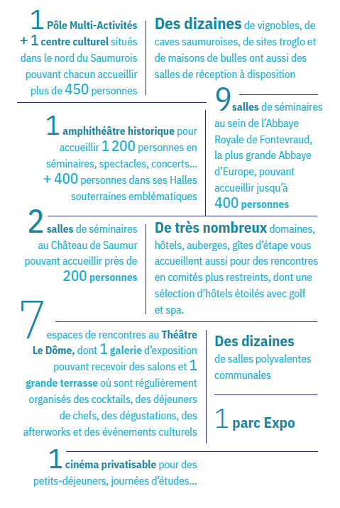 Tourisme d’affaires, rencontres business, évènements d’entreprise, séminaires, réceptions, salons professionnels, réunions d’équipe pourront être accueillis dans des lieux hors du commun : dans le calme religieux de l’Abbaye Royale de Fontevraud, au Théâtre Le Dôme à Saumur avec un cocktail sur son rooftop en fin de journée, dans une maison de bulles, dans des caves trogolodytiques, au Bioparc de Doué-en-Anjou, à l’Institut Français du Cheval et de l’Équitation, évidemment au Parc Expo de Saumur… et, depuis cet été, le Château de Saumur, « Château des châteaux de la Loire » par la richesse de son histoire et de son architecture, a ouvert dans sa partie la plus ancienne, son abbatiale, après de longs mois d’une restauration minutieuse de nouveaux espaces de séminaires. D’un côté le Château ; de l’autre les jardins et un panorama unique sur la Loire et la ville.