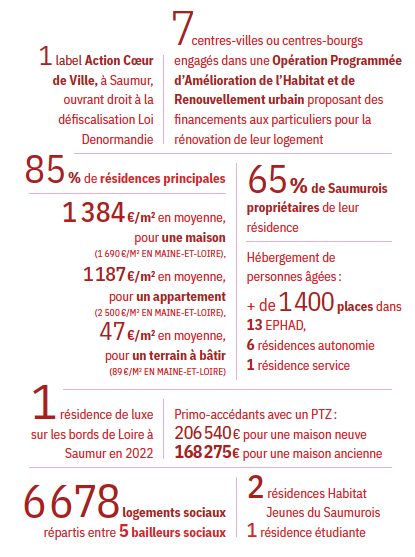Cet avantage se conjugue à une fiscalité attractive, que vous choisissiez de vous installer en centre-ville, à proximité de tous les services, ou dans un petit village calme et paisible, et que vous choisissiez une habitation troglodyte à Turquant, une chapelle désaffectée et rénovée à Saumur, une maison neuve à Allonnes ou encore une bâtisse en pierre de tuffeau à Gennes-Val-de-Loire. De surcroît, le logement constitue une priorité de l’action des collectivités et de l’office Saumur Habitat, avec de multiples dispositifs, notamment d’aides, qui s’adressent à différents publics, pour différents projets : aides à la rénovation de logements ou à l’adaptation au vieillissement et/ou au handicap en cœur de ville ou cœur de bourg, dispositif Action Cœur de Ville et Loi Denormandie, aménagement de zones d’habitation en périphérie directe des centre-villes, subvention pour la rénovation des façades, construction importante ou rénovation de logements sociaux...